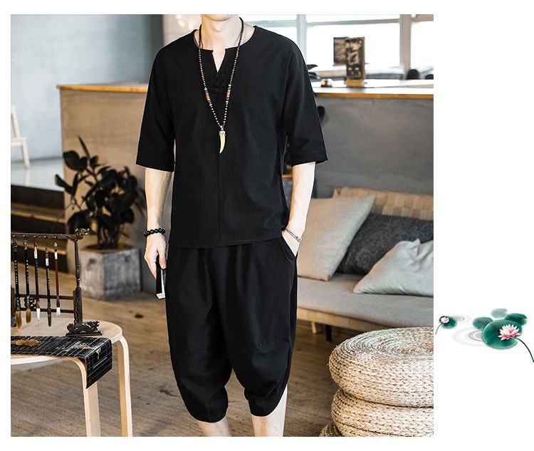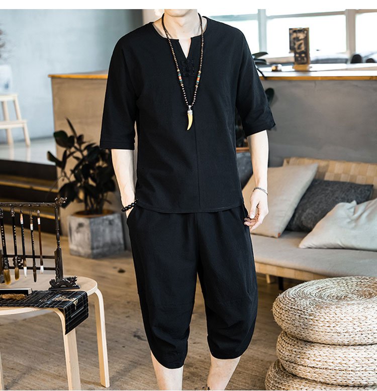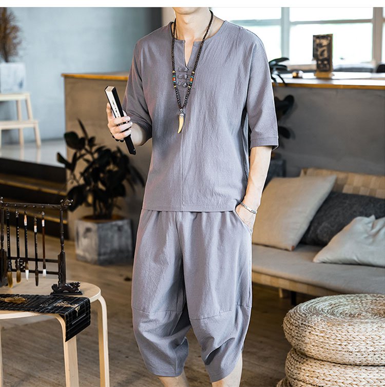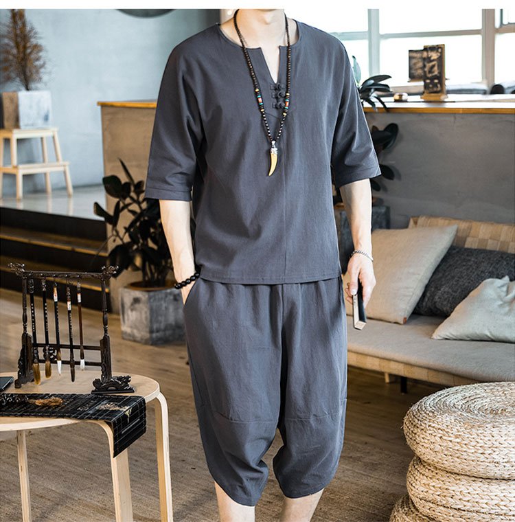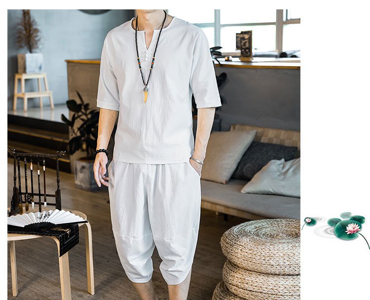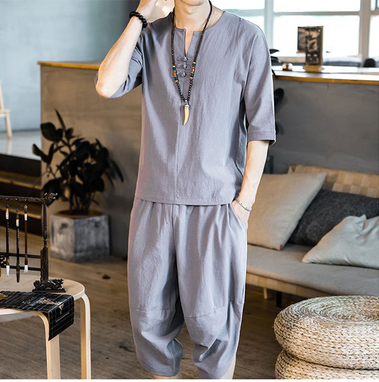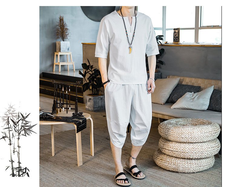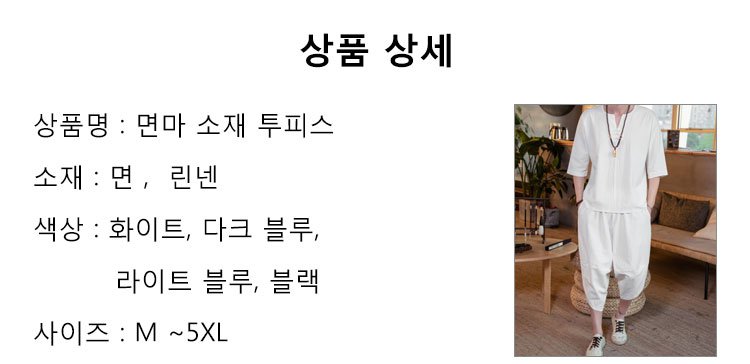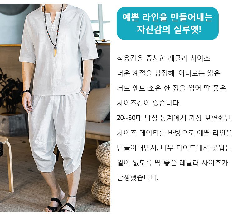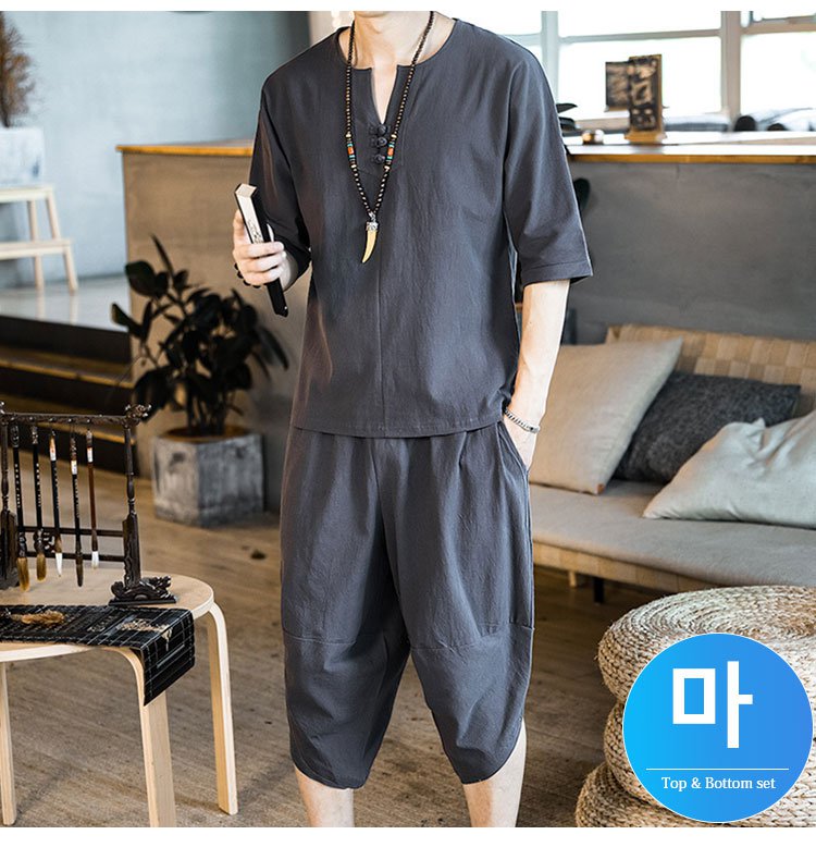 심플하고 편안한 면마 세트. 시원한 면마 소재, 여름에 적합! 코디에 걱정 없다!